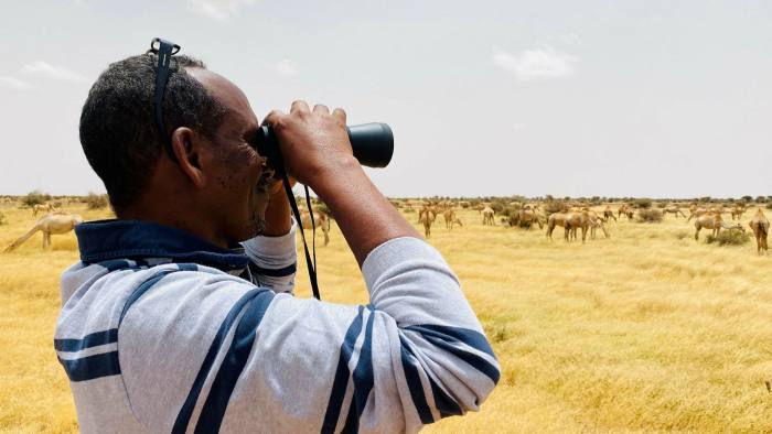 Mustafa Duale grabs his binoculars to check on 450 camels grazing on what used to be barren land in western Somaliland an unrecognised state in the Horn of Africa, between encroaching desert and the Gulf of Aden, which declared independence from Somalia in 1991.